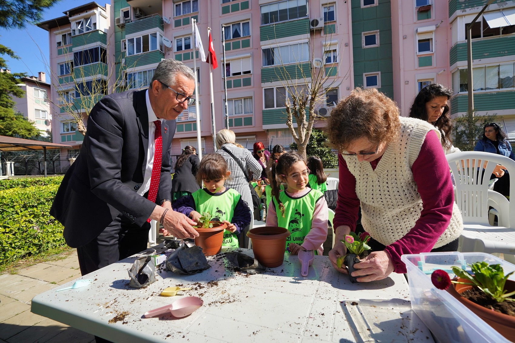 Gaziemir Belediyesi’nin, ilçede yaşayan 60 yaş üstü vatandaşların evlerinden çıkıp sosyalleşmeleri, mutlu ve sağlıklı bir yaşam sürmeleri için hizmet verdiği Ata Evi Sağlıklı Yaş Alma Merkezi, kuşaklararası köprü görevi de görüyor. Ata Evi’nde düzenlediği etkinliklerde yaş almış yurttaşlar ile gençleri bir araya getiren belediye, Yaşlılara Saygı Haftası’nda da özel bir etkinlik düzenledi. Etkinlikte, Ata Evi’nin üyeleri ile Gazi Umurbey Anaokulu’nun öğrencileri bir araya geldi. Belediye Başkanı Halil Arda ile Okul Müdürü Dilara Kaplan ve öğretmenlerin de katıldığı etkinlikte fidanlar ile çınarlar, saksılara çiçek diktiler. Minik öğrenciler, diktikleri çiçekleri Ata Evi üyelerine armağan ettiler.