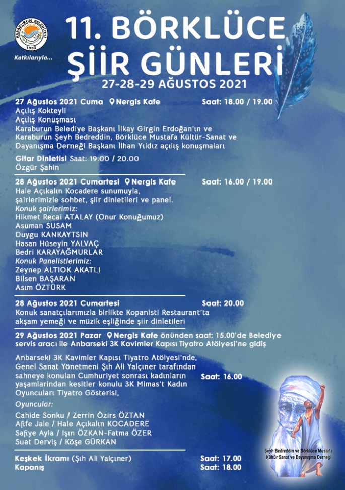 Şeyh Bedreddin ve Börklüce Mustafa Kültür Sanat ve Dayanışma Derneği tarafından Karaburun Belediyesi katkıları ile gerçekleştirilen, Karaburun’da geleneksel hale gelen sanat etkinliği Börklüce Şiir Günleri, 27-29 Ağustos tarihleri arasında sanatseverler ile buluşuyor.