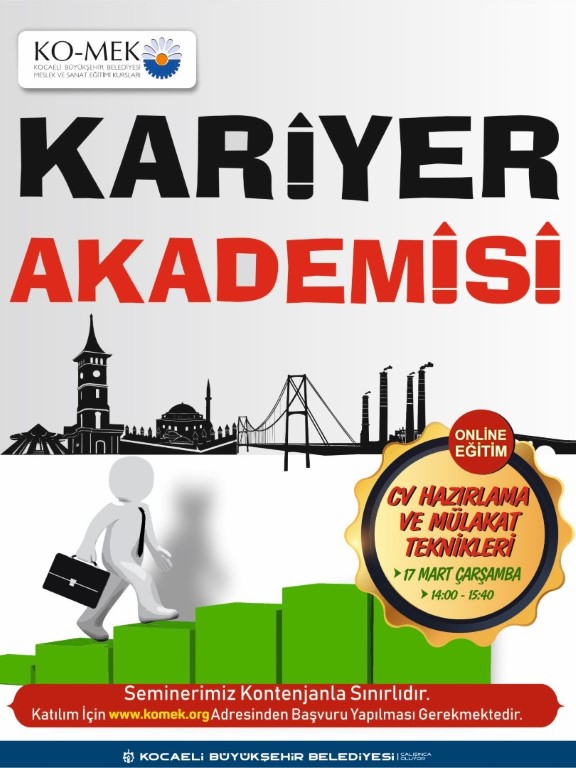 Kocaeli Büyükşehir Belediyesi Meslek ve Sanat Eğitim Kurslarının önemli eğitim projeleri arasında yer alan Kariyer Akademisi, yeni dönemde derslerine pandemi dolayısıyla online olarak başlıyor. 13 farklı konuda eğitim verecek olan Kariyer Akademisi’nin ilk online eğitimi 17 Mart Çarşamba günü “CV Hazırlama ve Mülakat Teknikleri” ile gerçekleştirilecek.