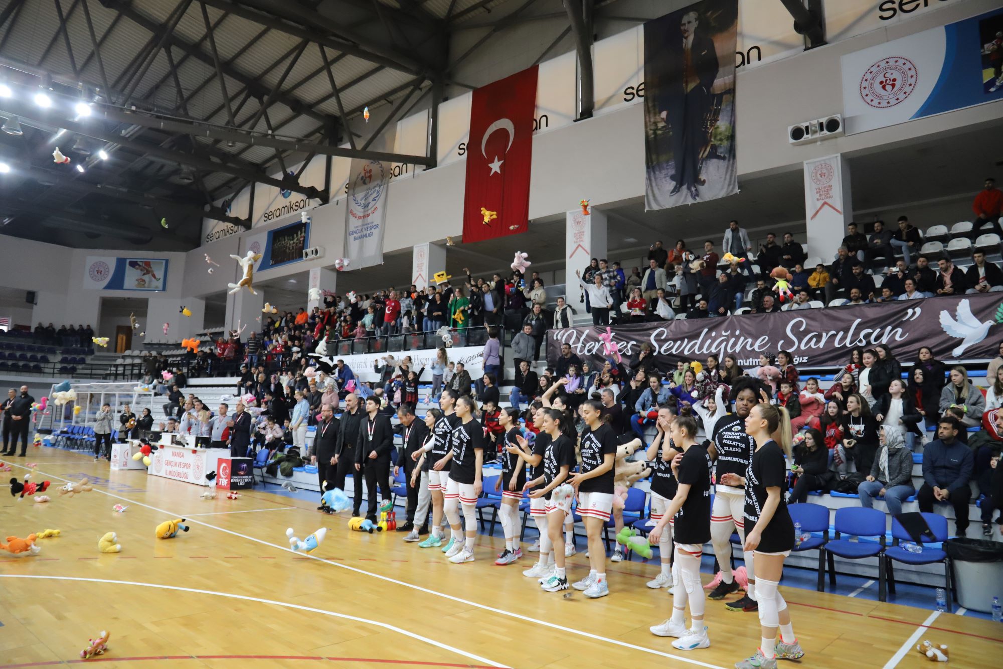 Kahramanmaraş merkezli ve 11 ilde yıkıma yol açan deprem felaketi sonrasında Turgutlu Belediyesi Kadın Basketbol Takımı anlamlı bir kampanyaya imza attı. “Bir Oyuncak Bir Mutluluk” isimli kampanyada maçı izlemeye gelen vatandaşlar tarafından getirilen oyuncaklar, maçın başlamasına 4 dakika 17 saniye kala sahaya atıldı. Saniyeler içerisinde çok sayıda oyuncak sahada toplandı. Söz konusu anlarda pek çok vatandaş gözyaşlarına hakim olamazken Yıldırım Beyazıt Spor Salonu’nda duygusal dakikalar yaşandı.